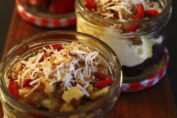 What: Berry Breakfast Jars with shredded coconut, goji berries, greek yoghurt and walnuts