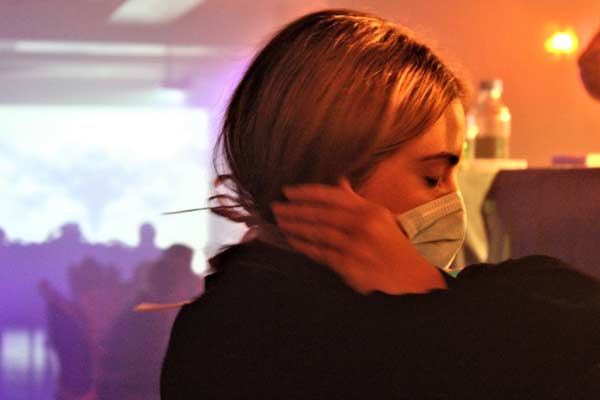 For the pre-show chats and dribbles at 'Dry Land' by Outhouse Theatre Co and Mad March Hare, we are surrounded by a photo exhibit and LED lights above as we pour into a